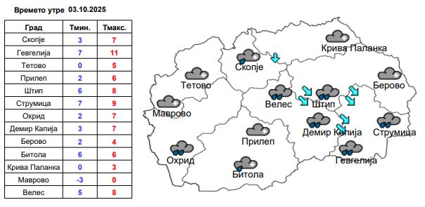 Утре низ кумановско ќе имаме променливо облачно време со слаб до умерен ветер од северен и североисточен правец.