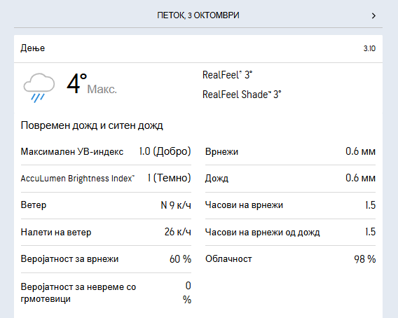 Температурата во утринските часови ќе се движи околу 2 степени, а максималната дневна ќе достигне 4 степени целзиусови.