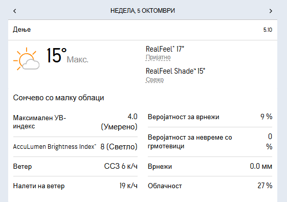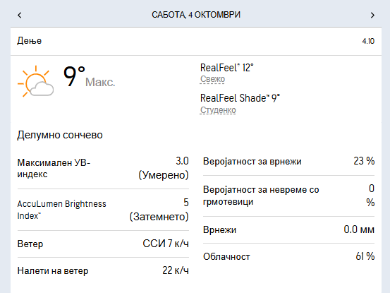 Температурата во утринските часови ќе се движи околу 8 степени, а максималната дневна ќе достигне до 15 степени целзиусови.