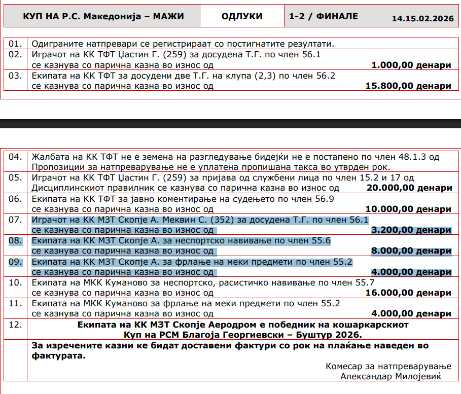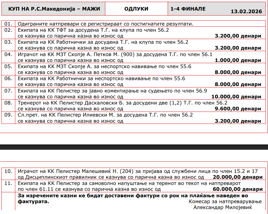 Македонската кошаркарска федерација изрече низа казни за екипите учеснички од Купот на Македонија, а најжестки беа за Пелистер.