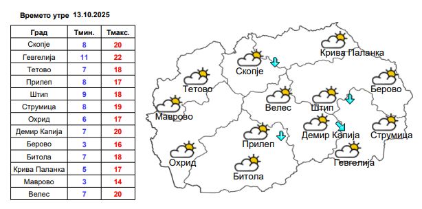 Утре низ кумановско ќе имаме претежно сончево време со мала облачност и слаб до умерен ветер од север. Утринската температура ќе се движи околу 7 степени, а дневниот максимум ќе се искачи до 17 степени целзиусови.