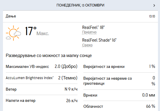 Температурата во утринските часови ќе се движи околу 7 степени, а максималната дневна се очекува да достигне 17 степени целзиусови.