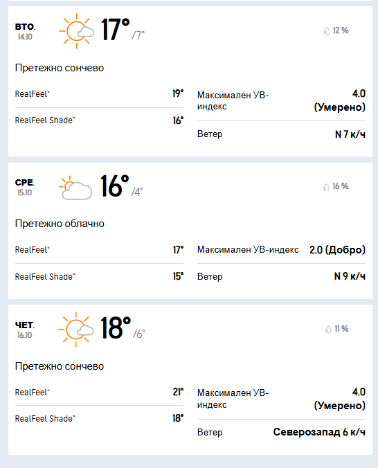 Во среда ќе имаме претежно облачно време со сосема кратки сончеви периоди. Ќе дува слаб до умерен ветер од север, а температурата ќе се движи во интервал од минимални 4 до максимални 16 степени целзиусови.