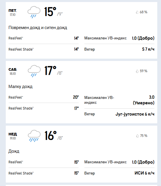 И во сабота ќе имаме облачно време со врнежи од дожд и слаб до умерен ветер од јужен и југоисточен правец. Утринската температура ќе се движи околу 8 степени, а максималната дневна се очекува да достигне 17 степени целзиусови.