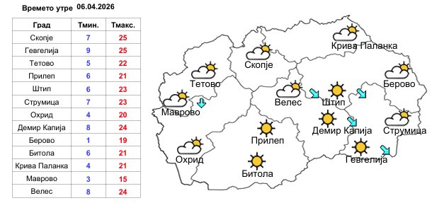 Утре низ кумановско ќе имаме исто така сончево и топло време со слаб до умерен ветер од северен и североисточен ветер. Температурата во утринските часови ќе се движи околу осмиот степен, а максималната дневна темпепратура ќе се искачи до 21 степен цезлиусов.