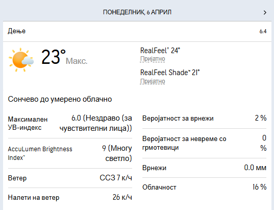 Утринската температура ќе се движи околу шестиот степен, додека максималната дневна се очекува да достигне 23 степени целзиусови.