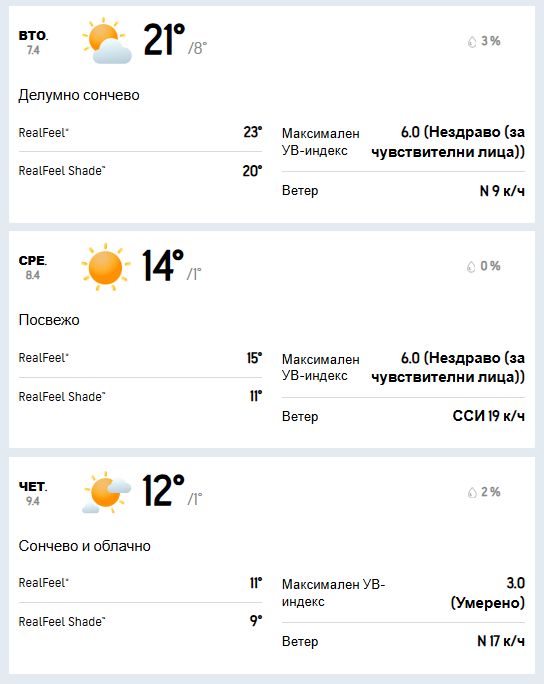 Сончево време, но со благ пад на температурата ќе имаме и во среда. Ќе дува умерен до засилен ветер кој на моменти ќе достигнува брзина и до 50 километри на час. Температурата во утринските часови ќе се спушти до само еден степен, а максимумот во текот на денот ќе достигне 15 степени целзиусови.