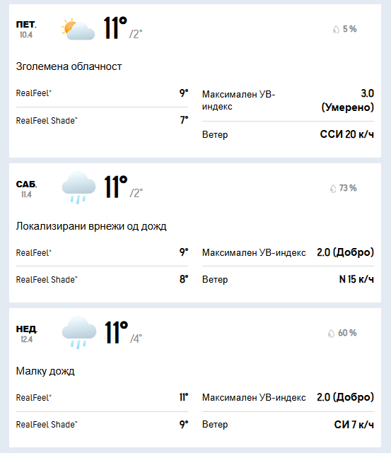 Во сабота ќе имаме облачно време со врнежи од дожд. Ќе дува слаб до умерен ветер од северен правец. Утринската температура ќе се движи околу два степени, а максималната дневна ќе се искачи до 11 степени целзиусови.