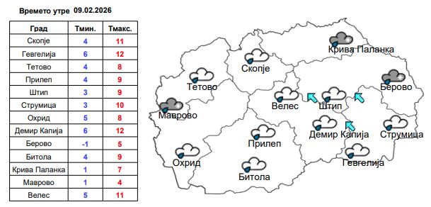 Утре низ кумановско ќе имаме облачно време со слаб до умерен ветер од југ и југоисток. Температурата во утринските часови ќе се движи околу 4 степени, а дневниот максимум ќе достигне 9 степени целзиусови.