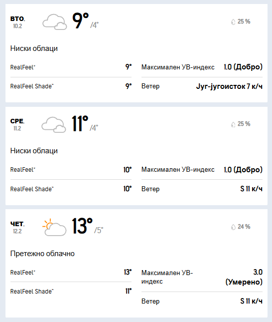 Во среда ќе имаме облачно време во текот на денот. Ќе дува слаб до умерено засилен ветер од јужен правец, а температурата ќе се движи во интервал од минимални 4 до максимални 11 степени целзиусови. Во вечерните часови ќе има врнежи од дожд.