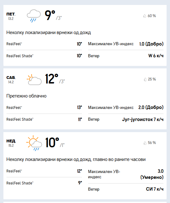 Облачно време со врнежи од дожд ќе имаме во петок. Ќе дува слаб до умерен ветер од западен правец. Утринската температура ќе се спушти до третиот степен, а максималната дневна ќе достигне 9 степени целзиусови.
