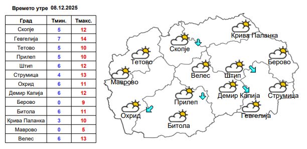 Утре низ кумановско ќе имаме претежно сончево време со мала облачност и слаб до умерен ветер од северен правец. Утринската температура ќе се движи околу еден степен во негатива, а максималната дневна ќе достигне 11 степени целзиусови.
