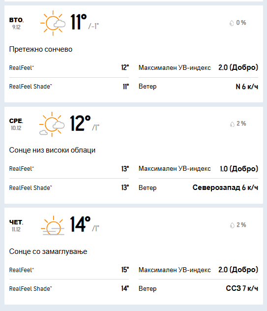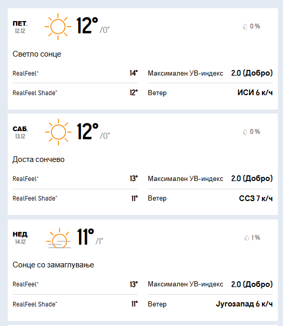 И во сабота ќе имаме сончево време со релативно висока дневна температура за овој период од годината. Ќе дува слаб до умерен ветер од северен и северозападен правец. Температурата во утринските часови ќе се движи околу нулата, а дневниот максимум ќе достигне 12 степени целзиусови.