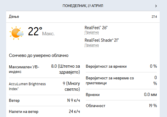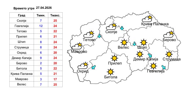 Минималната температура ќе биде во интервал од 2 до 12, а максималната ќе достигне од 20 до 25 степени.