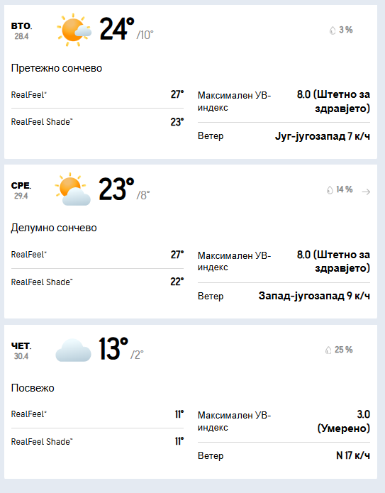 Среда носи променливо облачно време. Ќе дува слаб до умерен ветер од западен и југозападен правец, а температурата ќе се движи во интервал од минимални 8 до максимални 23 степени целзиусови.