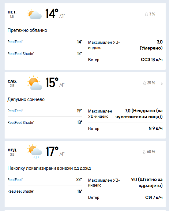 Во сабота ќе имаме променливо облачно време. Ќе дува слаб до умерено засилен ветер од северен правец. Минималната температура ќе се спушти до 4 степени, а максималната ќе достигне 15 степени целзиусови.