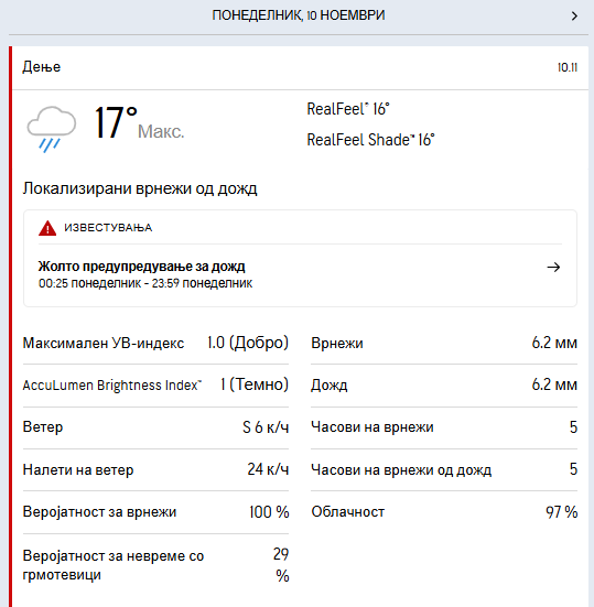 Наместа врнежите ќе бидат поројни и пообилни (над 30 l/m² за 24 часа) со услови за појава на грмежи. Ќе дува слаб до умерен ветер претежно од јужен правец.