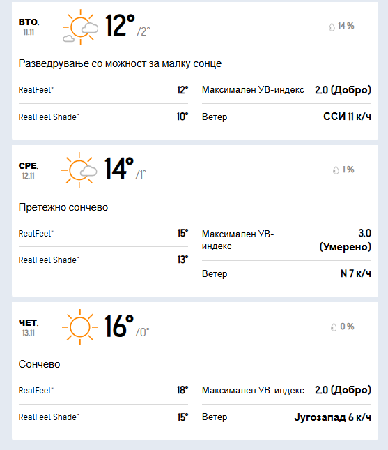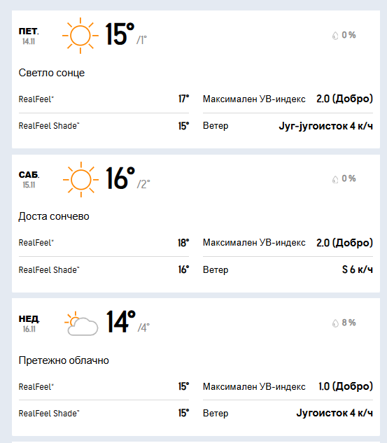 И во петок ќе имаме сончево време. Ќе дува слаб до умерен ветер од јужен и југоисточен правец. Утринската температура ќе се движи околу 1 степен, а дневниот максимум ќе достигне 15 степени целзиусови.