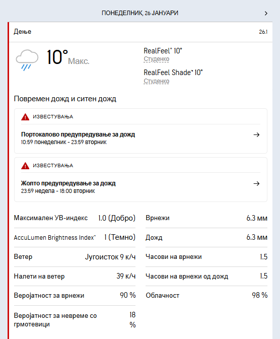 Поради опасност од обилни врнежи УХМР издаде жолт и портокалов метео аларм за одредени делови од државата.