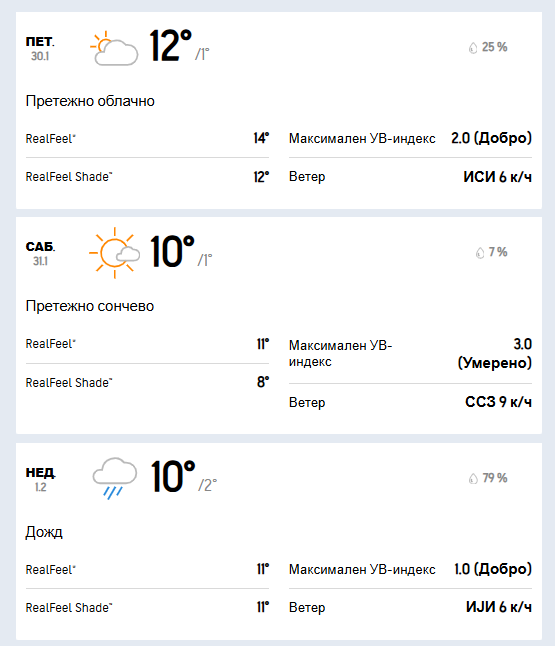 Петок носи облачно време со кратки сончеви периоди и слаб до умерен источен и североисточен ветер. Температурата во утринските часови ќе се движи околу 1 степен, а максималната дневна се очекува да се искачи до 12 степени целзиусови. Ноќта кон сабота повторно се очекуваат врнежи од дожд.