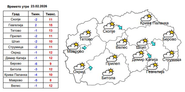 Утре низ кумановско ќе имаме претежно облачно време со многу кратки сончеви периоди. Ќе дува слаб до умерено засилен ветер од северен и северозападен правец. Температурата во утринските часови ќе се движи околу 2 степени, а дневниот максимум ќе се искачи до 10 степени целзиусови. Во вечерните часови се можни услови за дожд.
