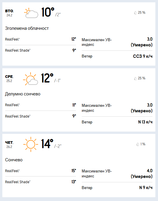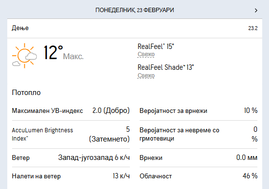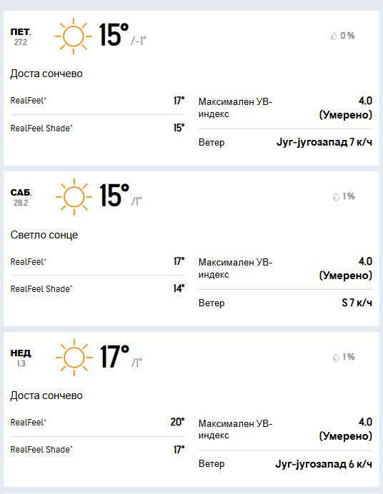 Во петок ќе имаме сончево и топло време со слаб до умерен ветер од јужен и југозападен правец. Температурата во утринските часови ќе се движи околу еден степен под нулата, а максималната дневна ќе се искачи до 15 степени целзиусови.
