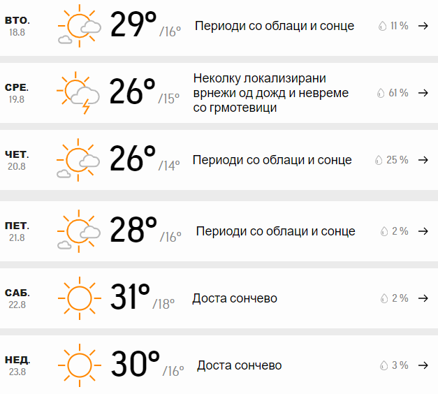 И во следните денови претпладне сончево со мала до умарена облачност, во попладневните часови ќе има локална појава на пороен дожд и грмежи. Во среда на повеќе места да биде нестабилно, а локално процесите да бидат и поинтензивни.