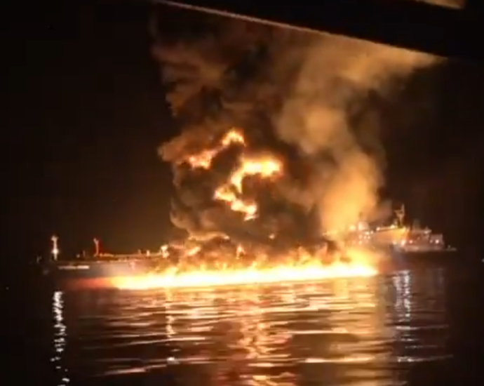 Видеото го прикажува моментот на силна експлозија и пожар на море откако бродот бил погоден покрај брегот на Ирак.