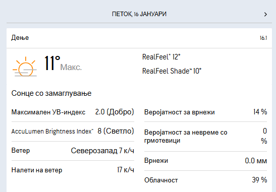 Утринската температура ќе се движи околу еден степен под нулата, додека максималната дневна се очекува да достигне 11 степени целзиусови.