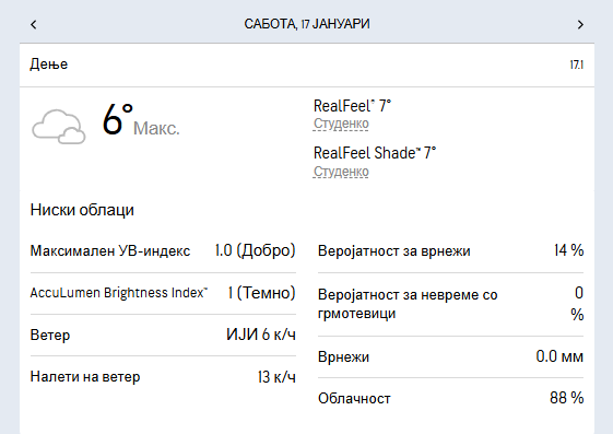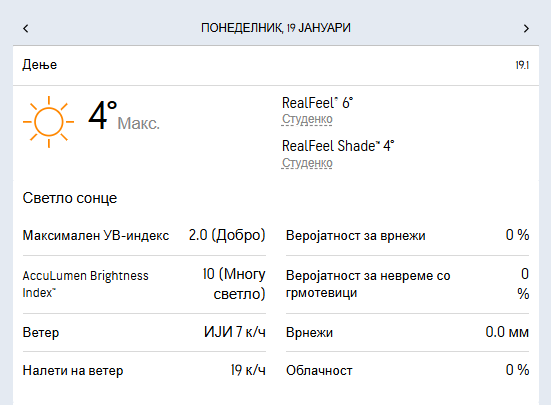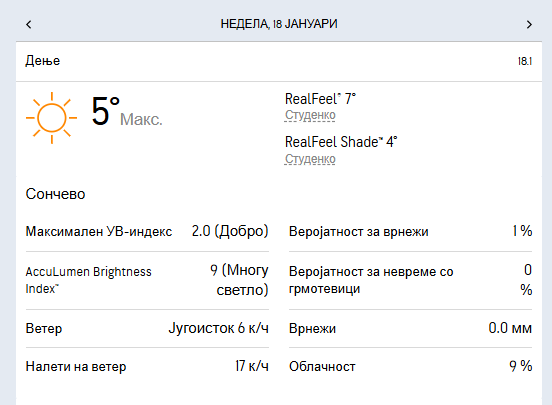 Минималната температура ќе се спушти до -6 степени, а максималната дневна ќе се искачи до 5 степени целзиусови.