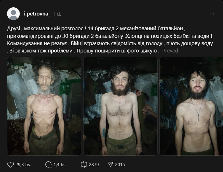 „Момчињата се на позиции без храна и вода. Командата не реагира. Борците губат свест од глад и пијат дождовница. Исто така, има проблеми со комуникацијата“, се вели во објавата на социјалните мрежи со фотографии од војниците.