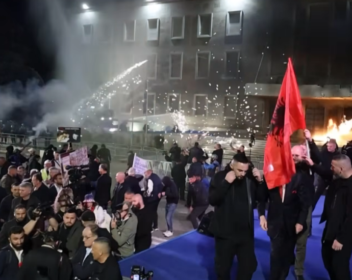 Демонстрантите фрлаа молотови коктели и пиротехнички средства кон зградата на Кабинетот на премиерот на Албанија, на што полицијата одговори со водени топови.