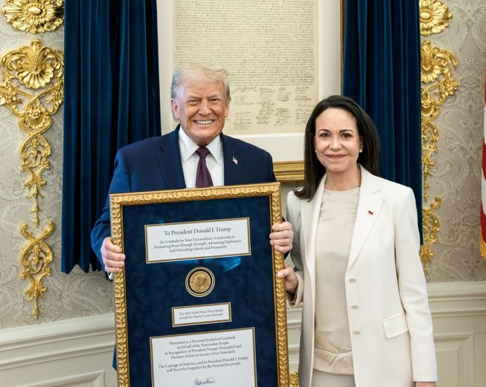 Венецуелската опозициска политичарка Марија Корина Мачадо му ја врачи Нобеловата награда за мир на Доналд Трамп за време на состанокот во Белата куќа, велејќи дека тоа е признание за посветеноста на американскиот претседател на слободата на нејзината земја.