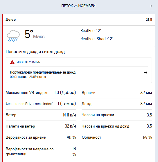 Времето денеска низ Македонија ќе биде облачно со повремени врнежи од дожд, пообилни во источните делови (над 35 l/m²).