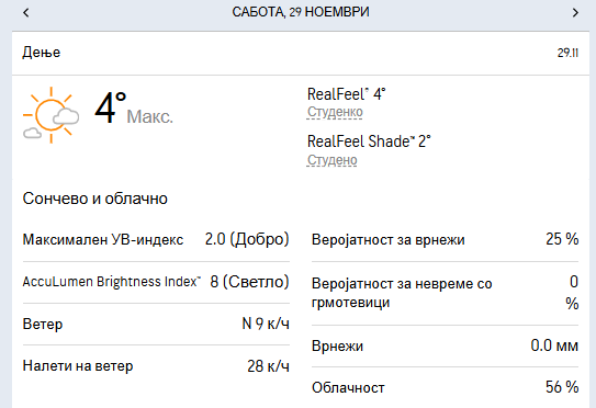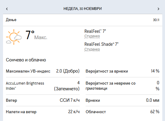 Ќе дува слаб до умерен ветер од северен и североисточен правец, а температурата ќе се движи во интервал од минимални 0 до максимални 7 степени целзиусови.
