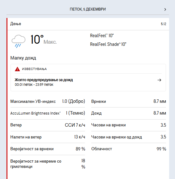 Максималната температура ќе биде во интервал од 8 до 12 степени.