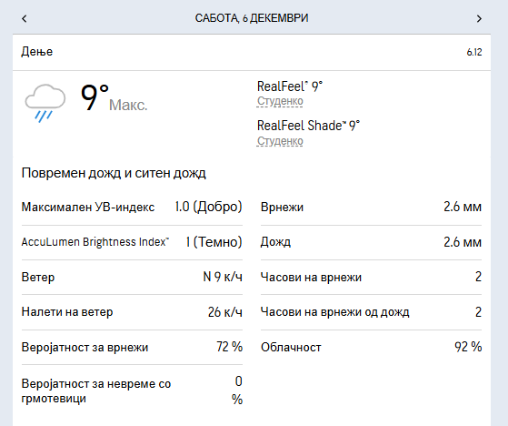 Ќе дува слаб до умерен ветер од север, а температурата ќе се движи во интервал од минимални 4 до максимални 10 степени целзиусови.