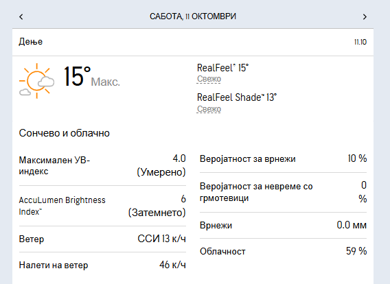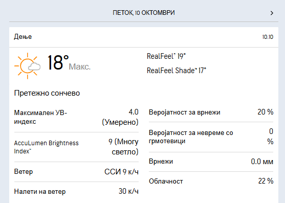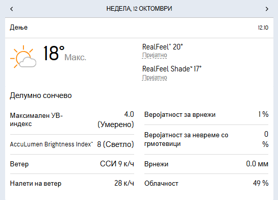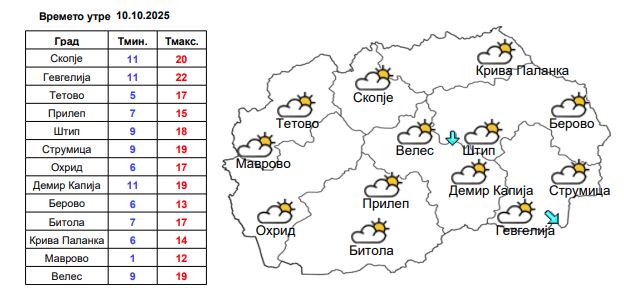 Утринската температура ќе се движи околу 10 степени, додека максималната дневна се очекува да достигне 18 степени целзиусови.