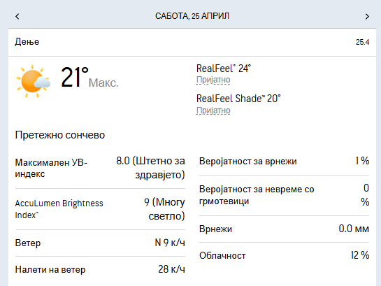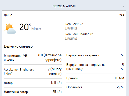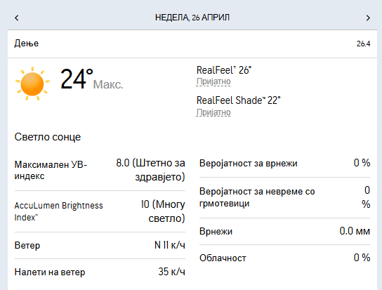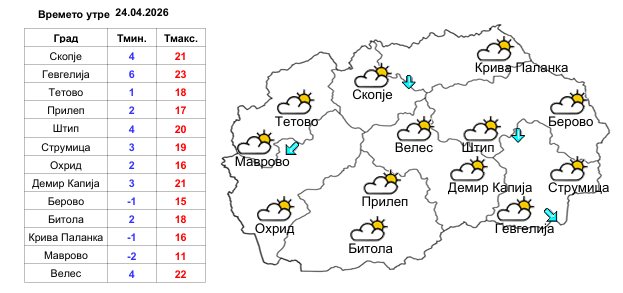 Минималната температура ќе се спушти околу 4 степени, а максималната во текот на денот ќе се искачи до дури 24 степени целзиусови.