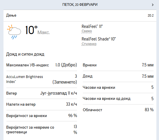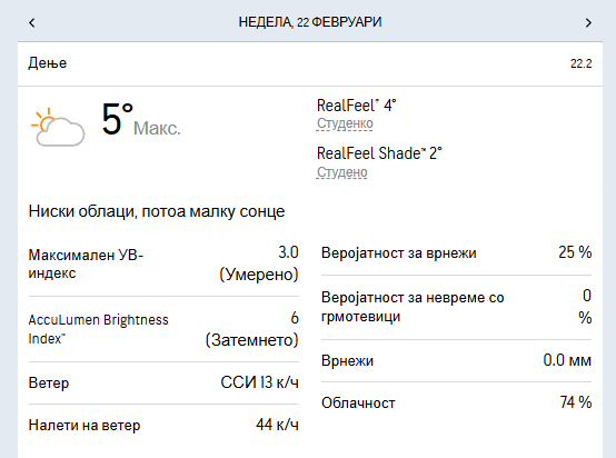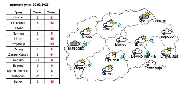 Утринската температура ќе се движи околу три степени, додека максималната дневна се очекува да достигне 10 степени целзиусови.