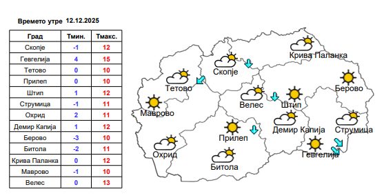 Максималните температури ќе се движат во интервал од 10 до 15 степени целзиусови.