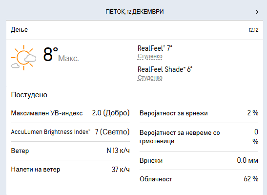 Утринската температура ќе се движи околу 2 степени, додека максималната дневна се очекува да достигне 8 степени целзиусови.
