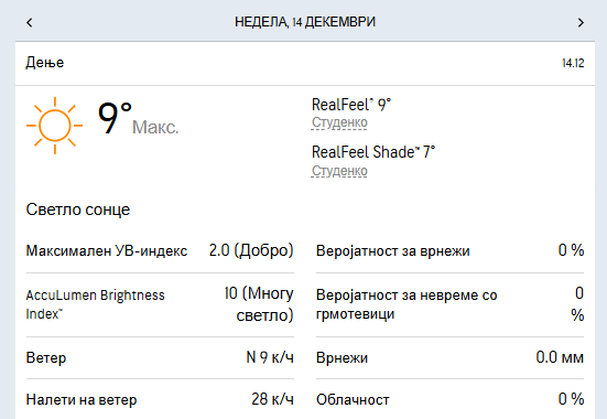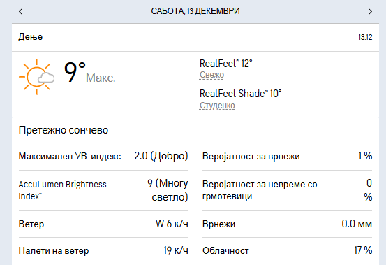 Утринската температура ќе се движи околу -2 степени, а дневниот максимум се очекува да се искачи до 9 степени целзиусови.