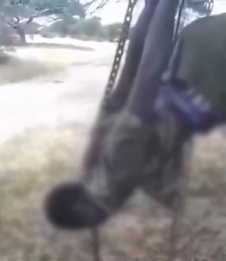 На едно видео, може да се види човек со врзани раце и нозе, како виси наопаку од дрво со синџири, додека снимателот го обвинува дека се обидел да шверцува храна во градот.